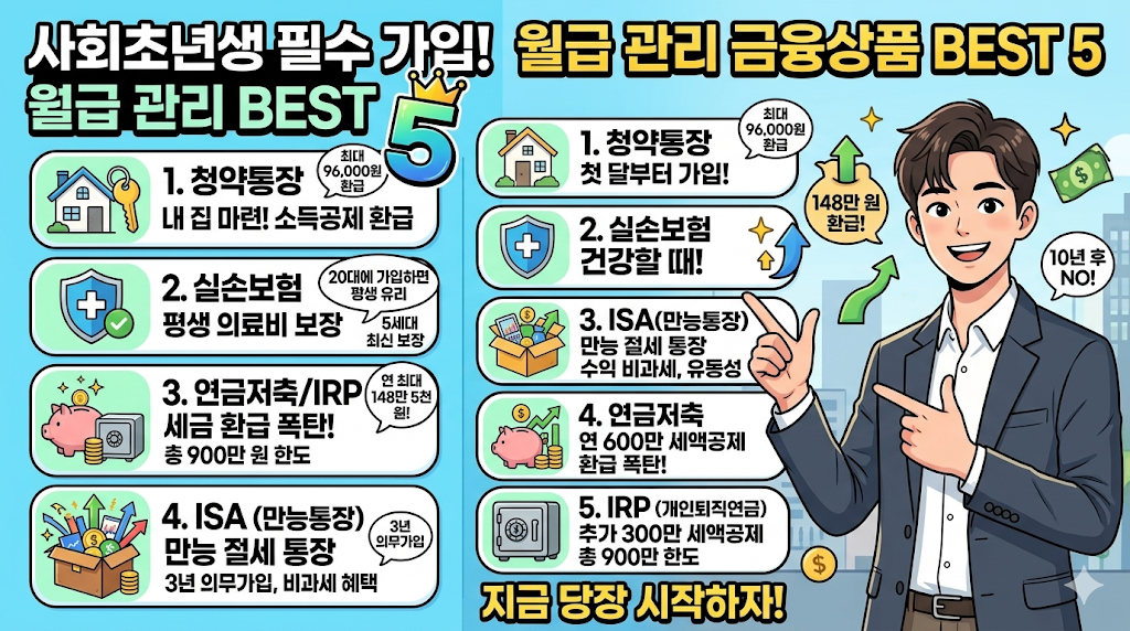 솔직히 저는 첫 월급을 받고 나서 어디에 얼마나 넣어야 하는지 전혀 몰랐습니다. 주변에서는 청약, 연금저축, IRP, 실손보험을 전부 가입해야 한다고 했지만, 월급 대부분을 재테크에 쓰면 당장 생활비가 부족할 것 같아 막막했습니다. 하지만 직접 자료를 찾아보고 우선순위를 정하니 생각보다 단순해졌습니다. 지금부터 제가 실제로 겪은 시행착오와 함께, 사회초년생이 반드시 알아야 할 금융상품 5가지를 구체적인 수치와 함께 정리해드리겠습니다.